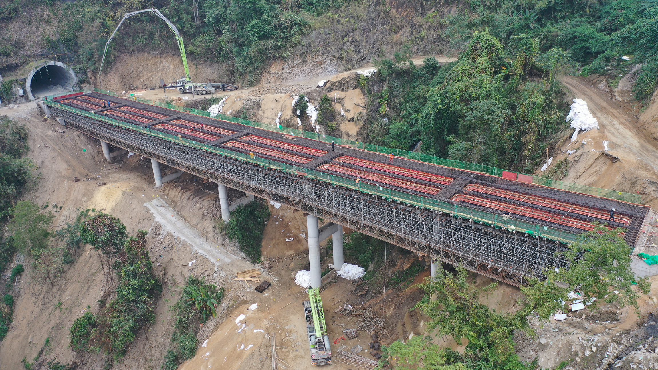 紅莫3號大橋位于項目標段起點,左幅現(xiàn)澆箱梁采用組合支架法施工,箱梁混凝土分兩次澆筑,首次澆筑箱梁底板和腹板,第二次澆筑箱梁頂板及翼板,此次為首次混凝土澆筑。為保證混凝土順利澆筑,元綠高速土建五分部提前謀劃落實各項工作任務(wù),從箱梁架體基礎(chǔ)施工、貝雷片組裝、組合支架搭設(shè)及預(yù)壓、箱梁鋼筋綁扎、模板安裝到混凝土澆筑等各環(huán)節(jié),技術(shù)人員均全程旁站管控,歷經(jīng)17個小時,最終順利完成混凝土澆筑。接下來,項目部全體成員將在確保安全和質(zhì)量的前提下,加快剩余工程施工。