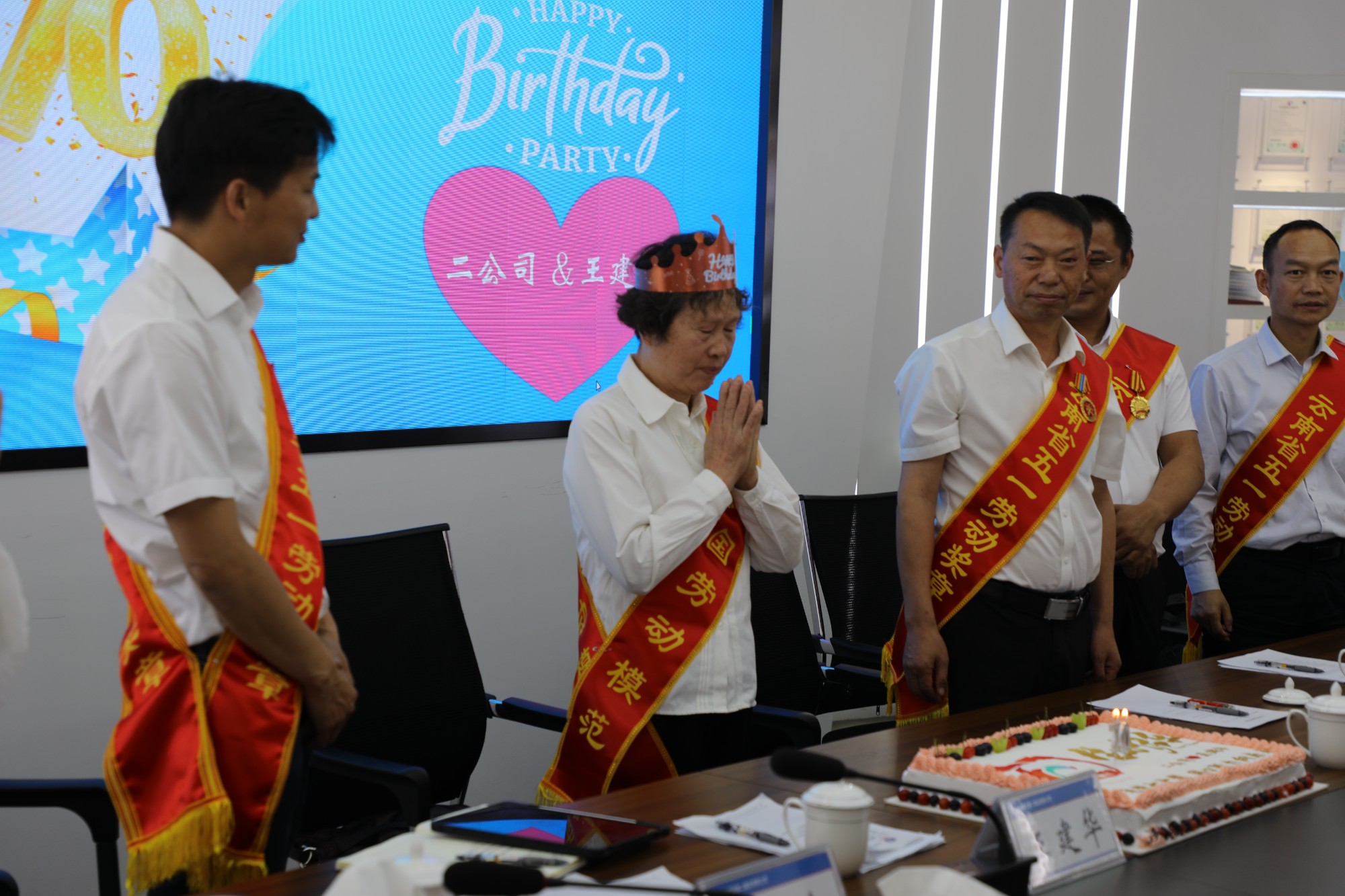 而此時,驚喜也在悄然而至,公司的暖心小廚早已把一切準備妥當。2023年是公司成立70周年,同時也是全國勞模王建華的70周歲生日。為慶祝公司成立70周年以及這位與公司同齡的杰出女性生日,公司精心準備了驚喜。當印有公司70周年主題logo和二公司&王建華的的方形大蛋糕被端上桌時,現(xiàn)場掌聲雷動,溫馨的氛圍達到了頂點。閃亮的生日帽裝點著王建華慈祥的面龐,在“祝你生日快樂,祝你生日快樂……”的歌聲中,王建華雙手合十許下愿望,她說:“我的生日愿望可以告訴大家,那就是祝福公司發(fā)展越來越好!”隨后,巨大的蛋糕被分成了無數個小塊,大家迫不及待地品嘗起來,感受著從舌尖蔓延至內心的甜蜜。