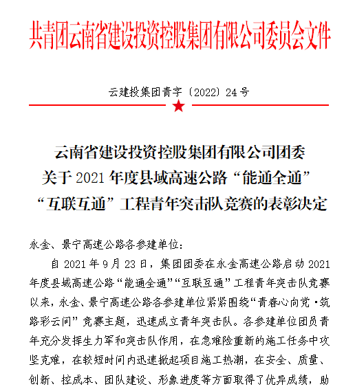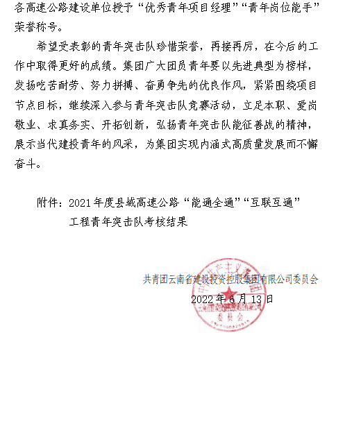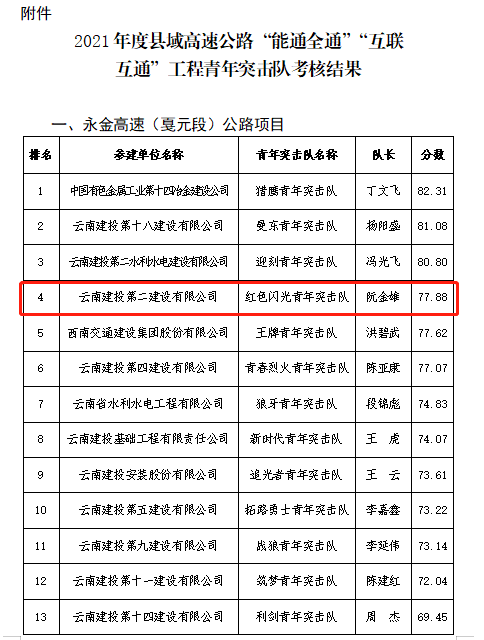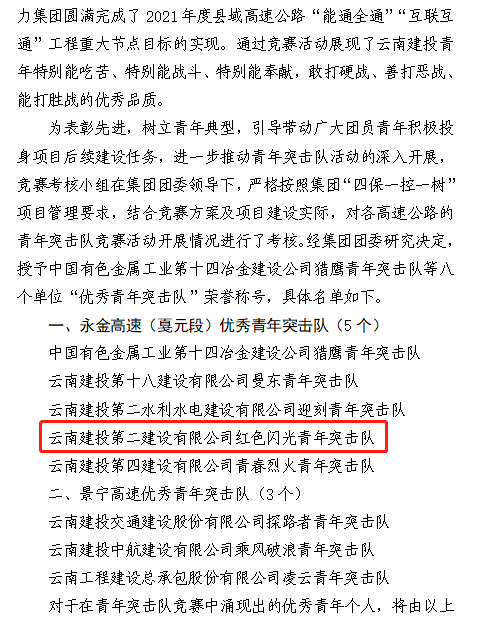 6月13日,集團團委下發(fā)了《關于2021年度縣域高速公路“能通全通”“互聯(lián)互通”工程青年突擊隊競賽的表彰決定》公司第十九直管部永金高速紅色閃光青年突擊隊赫然在列,在本次考核中,紅色閃光青年突擊隊以考核第四名的成績獲評集團團委永金高速優(yōu)秀青年突擊隊。