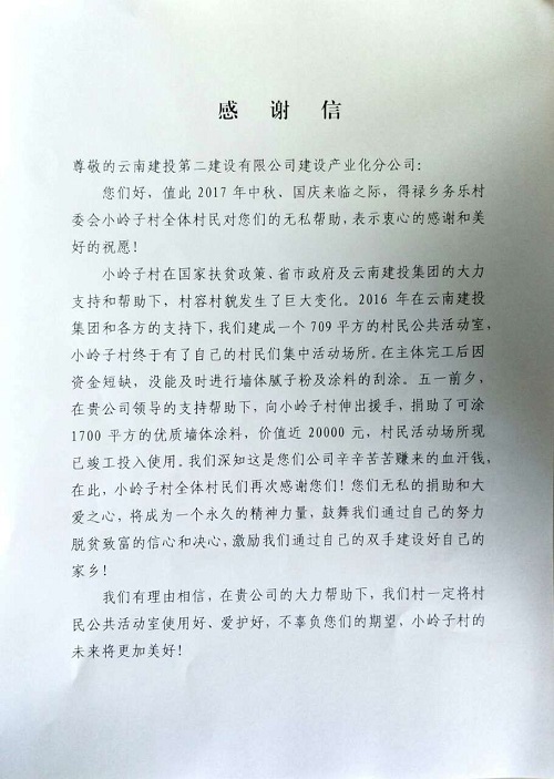 近日,建設(shè)產(chǎn)業(yè)化分公司收到來(lái)自宣威市得祿鄉(xiāng)務(wù)樂(lè)村委會(huì)小嶺子村全體村民的感謝信,感謝分公司對(duì)建蓋公共活動(dòng)室的幫助。